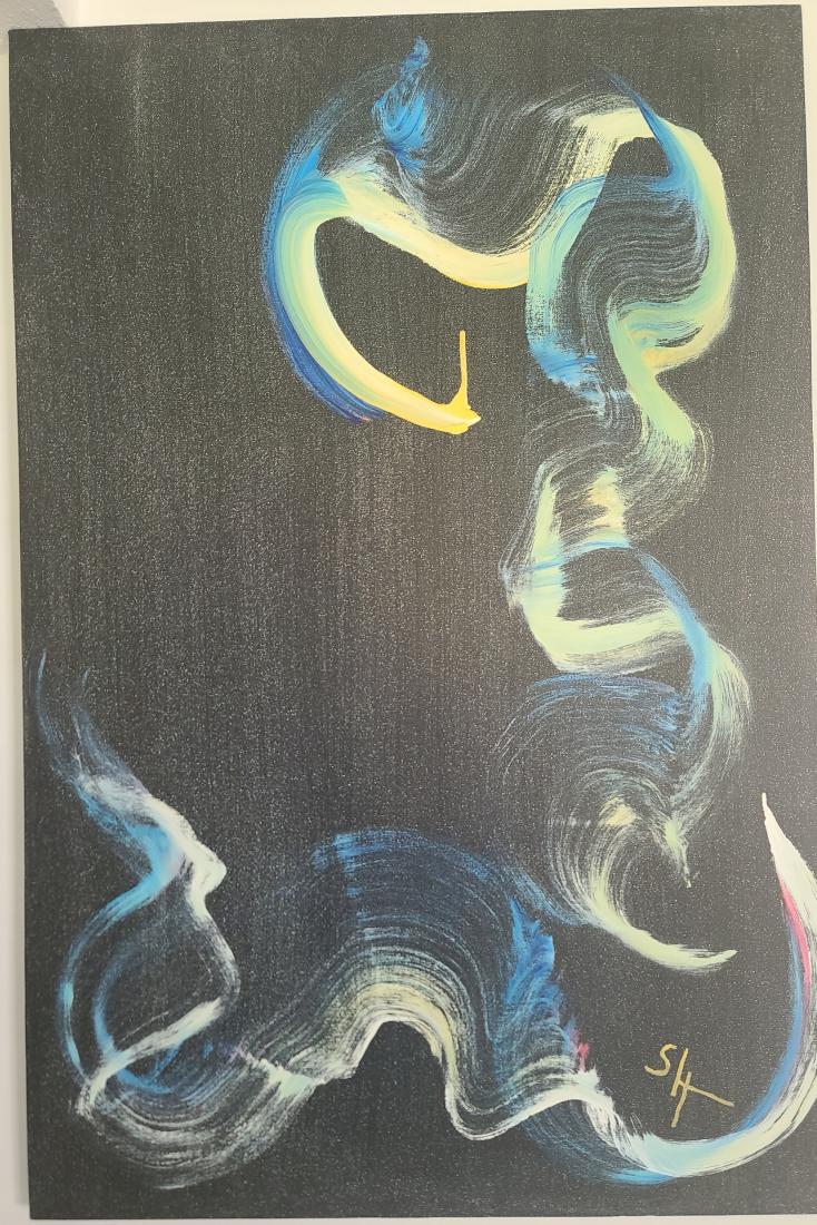 toile mixte , montée sur chassis - 1,50 m X 1,00 m - fond noir poudré d'argent , - encres sérigraphiques or, blanche, bleue, rose.