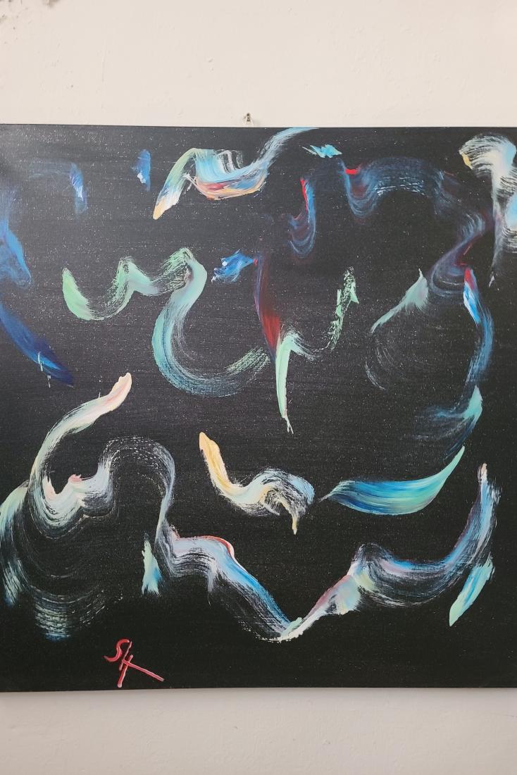 toile mixte , montée sur chassis 3 D - 1 m X 1 m - encres sèrigraphiques multiples pour ce foisonement coloriel.